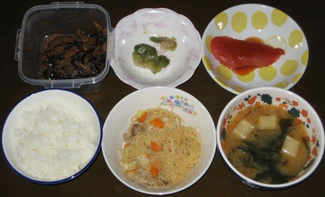 昼食:焼きビーフン、味噌汁、明太子、搾菜、ホタテ海苔佃煮