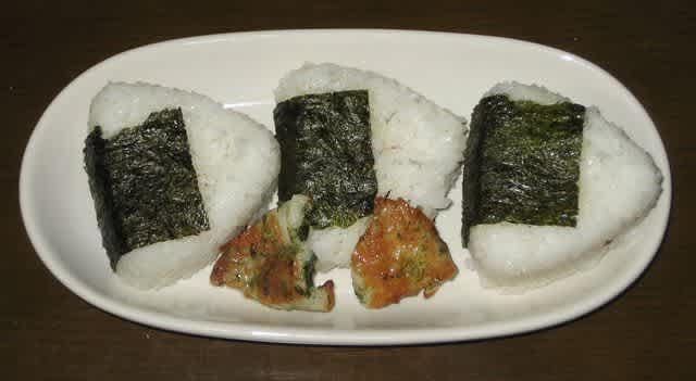 真ん中と左がおかか。右の少し大きいのが別のふりかけ。竹輪は残っていたもの。