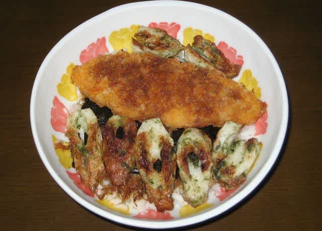 出汁ご飯の上に醤油鰹を乗せ、海苔を置いて白身魚フライと磯辺竹輪を配して出来上がり。漬物はなかったので置かなかったけど、よく考えたら搾菜があったのでおいても良かった。