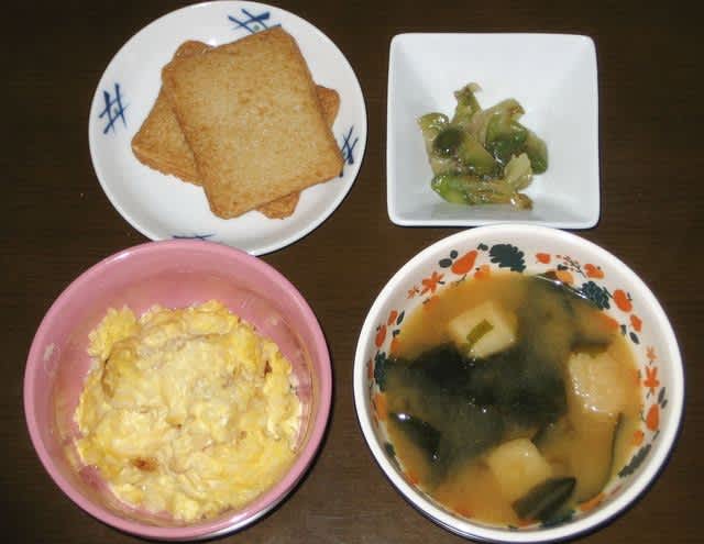 朝食:昨日の雑炊、搾菜、平天、味噌汁