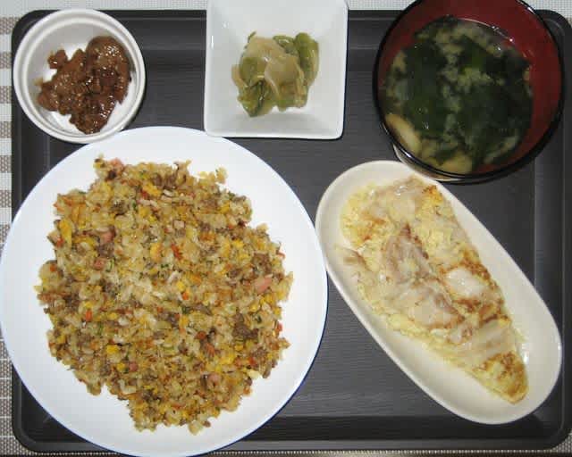 夕食:炒飯、キャベツの卵包み、自作味噌汁、搾菜、肝の甘露煮