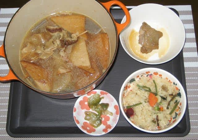 夕食:山菜ご飯、おでん、自作照り焼きチキン、搾菜