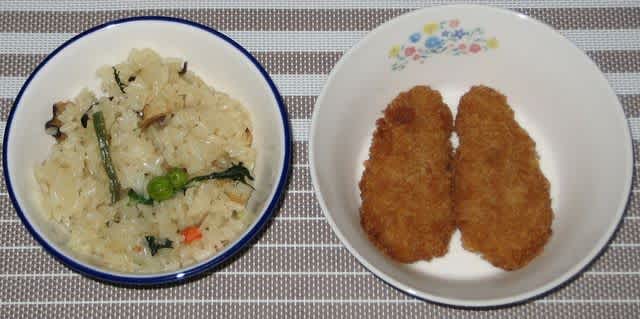 山菜おこわは以前買っていたもの。面白がって色々な料理を作っていたので食べ忘れていた。チーズ挟みフライも同様。どちらも40%OFF。お安くすんでいる。
