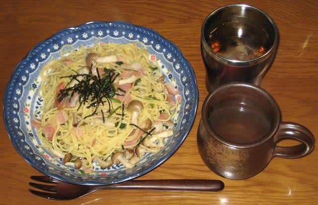 夕食:和風パスタ+淡路島のタマネギスープ(コンソメ)