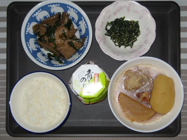 夕食:おでん(試食)、レバニラ、ほうれん草のバター炒め、青しばのり