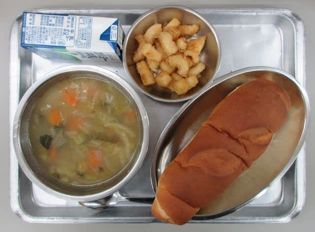 イカは美味しかったです。スープになんかラグビーボールの小さいような粒が入っていたと思ったら、多分それが「もち麦」だったんでしょう。周辺の人たちにあまり好まれなかったのがパン。いつもより甘いなと思ったらバターロールパンで、これをさほど好きでない人が多かったみたい。確かになんか重い感じだった。