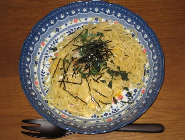 夕食:ペペロンチーノ+卵=ぺぺ玉(大葉添え)