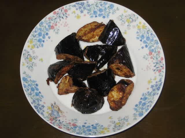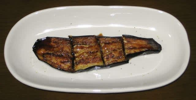 茄子が一部傷んでいたので、そこをカットして残りを焼いて、ウナギの蒲焼きのタレ+山椒をかけたもの。