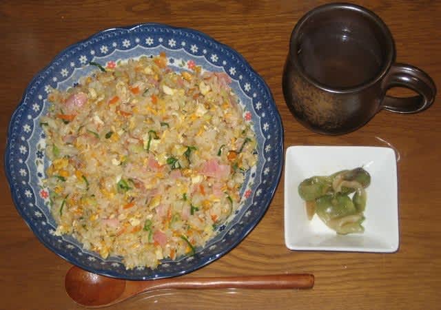 夕食:手作り炒飯、搾菜、タマネギスープ
