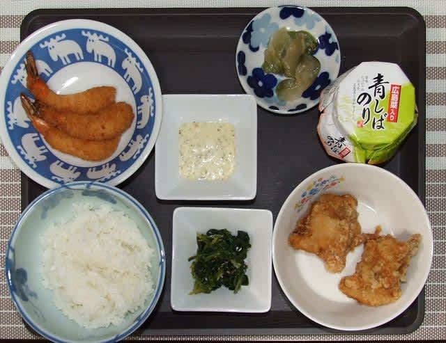 夕食:エビフライ、搾菜、青しばのり、縁の唐揚げ2個、ほうれん草のバター炒め、粕汁
