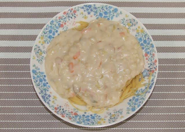 以前のクラムチャウダーが残っていたので、パスタにかけただけ。楽で美味しい。