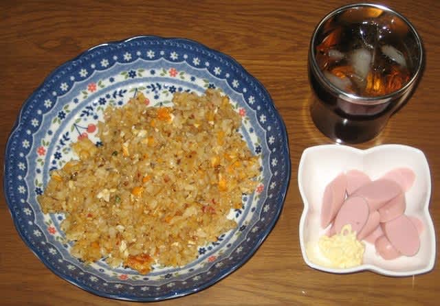 朝食:家人に作って貰った炒飯、魚肉ソーセージ