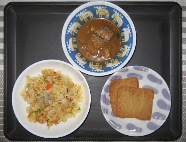 朝食:半炒飯、平天2枚、鯖の味噌煮缶詰の残り