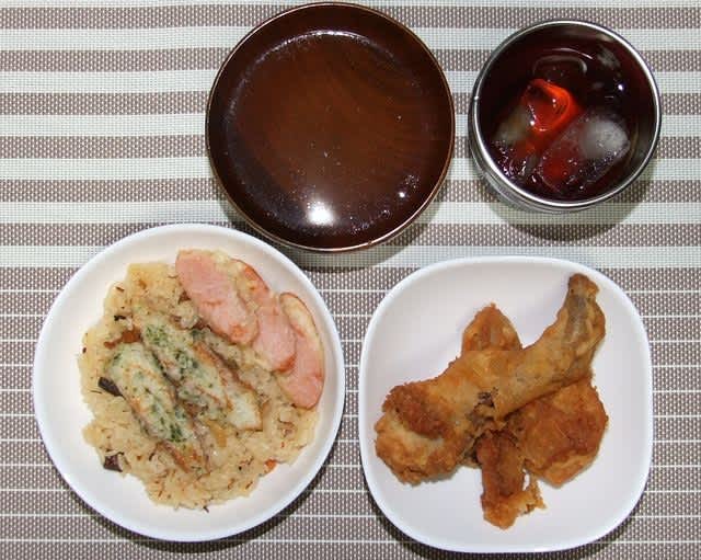 夕食:鶏釜飯、竹輪の磯辺揚げ、魚肉ソーセージ揚げ、KFC、タマネギコンソメ