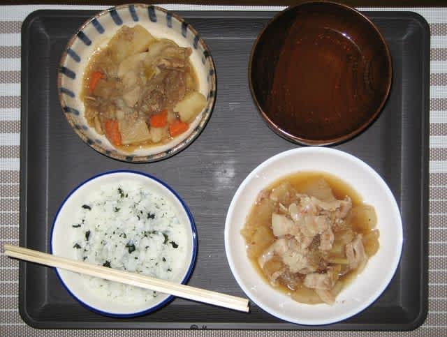 朝食:肉じゃが、豚バラ大根、わかめご飯、タマネギスープ