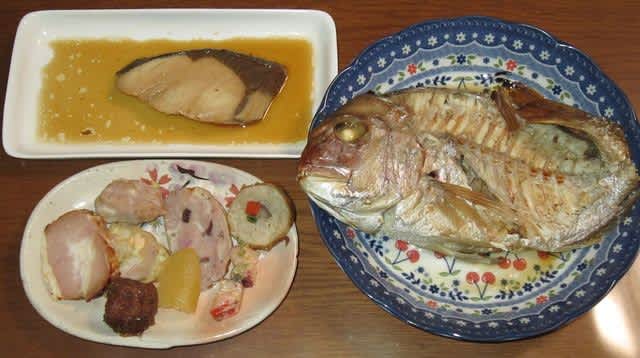 夕食:白ご飯、海苔、ブリの照り焼き、おせちの残り、鯛の残り