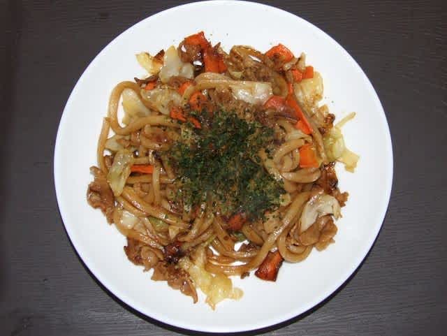 鉄フライパンの焼きうどん。味付けはマルちゃんの焼きそば付属のソース。