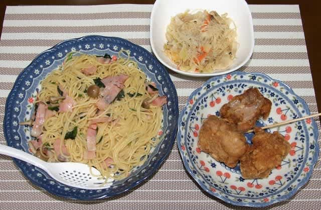 夕食:ほうれん草とベーコンのパスタ、焼きビーフン、縁の唐揚げ