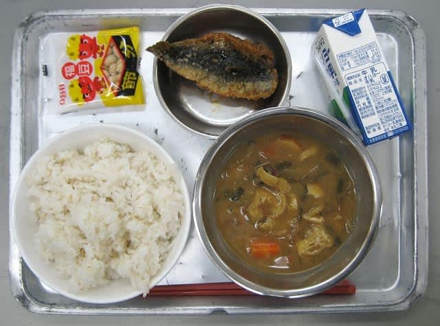 昼食:イワシの蒲焼き、味噌汁、麦ご飯、節分豆