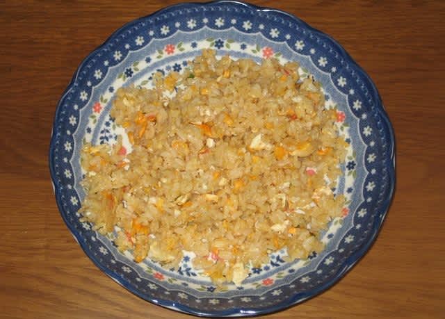 今日は面倒な仕事があるので、朝は作ってもらいました。先日買ったカニ炒飯の素。永谷園の炒飯の素で、私が買うのはカニ炒飯、五目炒飯、焼き豚炒飯の3種類。一番オーソドックスで一番当たり障りのない美味しいのが焼き豚炒飯なんだけど、時々五目やカニを食べたくなる。この2つの方が味が薄いので、冬には良いんだよね。夏は汗かくから少し辛めの方が良い。