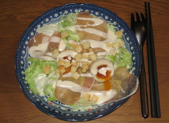 夕食:ぺぺ玉(生卵がらめペペロンチーノ)、シーザーサラダ