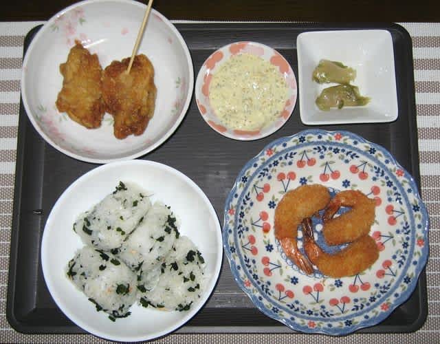 わかめご飯は昨日作っておいた。1合全部おにぎりにして置いた。後は残り物。