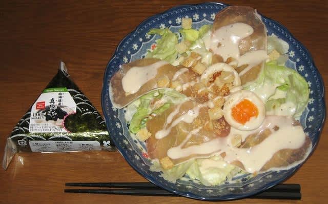 ヤマザキ春のパン祭りのシールのためにおにぎりを買ってきていた。これも1点。3種類買ってきてくれていたのだけど、これが一番負担が少ないかと食べてみた。1個完食できた。サラダも作って貰った。半分は食べられた。