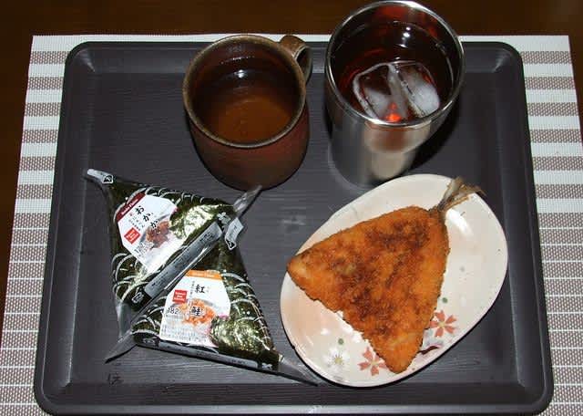 朝食:ヤマザキのおにぎりとアジフライ、タマネギコンソメ