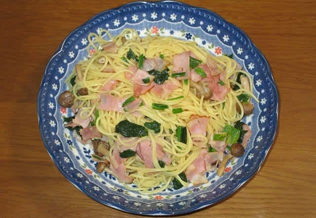 夕食:ほうれん草とベーコンのパスタ、シーザーサラダ、ホタテとエビのサラダ