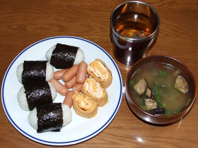 朝食:おにぎりセット、茄子の味噌汁(インスタント)