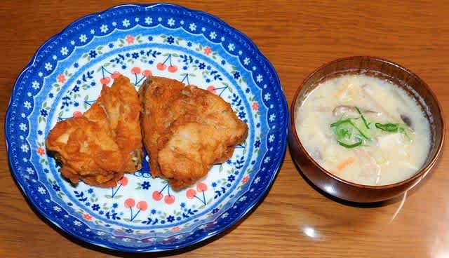 夕食:おにぎり、シーザーサラダ、KFCと粕汁