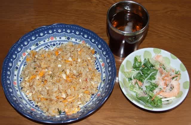 朝食:インスタント卵炒飯、エビ入りサラダ