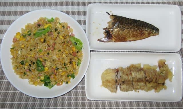 朝食:レタス炒飯(自作)、残ったサバ、げそ天