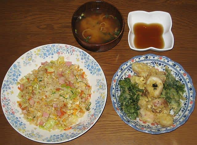 夕食:キャベツ炒飯、イカ天、あさげ、菜の花の天ぷら