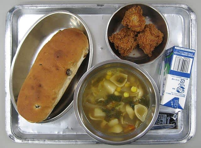 昼食:チキンカツ、マカロニスープ、ぶどうパン