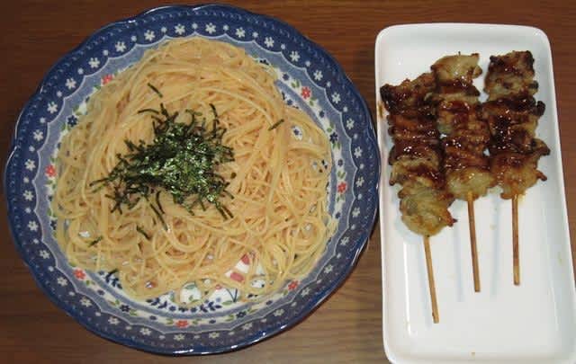 夕食:たらこバターパスタ、皮焼き(タレ)