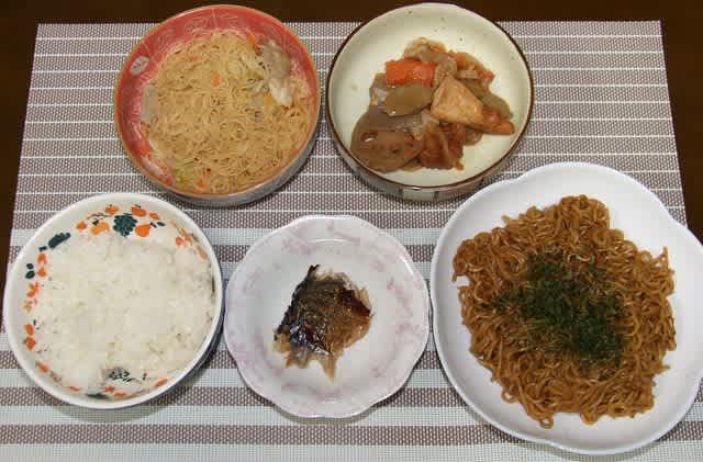 夕食:焼きそば、残ったサバ、筑前煮、焼きビーフン