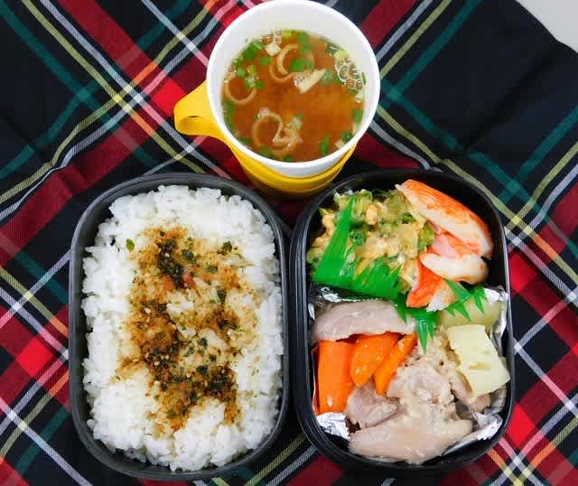 鶏肉の塩麹焼き(+野菜)、カニカマっぽいやつ、ネギと挽肉の卵がらめ