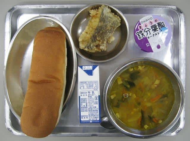 昼食:コーンスープ、白身魚のスパイス揚げ、ヨーグルト、米粉パン