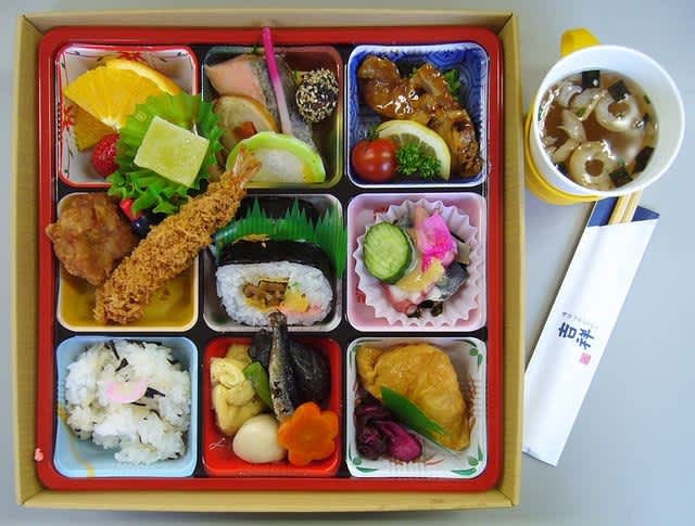 キレイで食べるところのないいつものお祝い弁当。おかずは良いのだけど、ご飯の量が少なすぎて困る。女性向きか修行僧用。