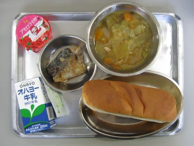 昼食:バターロールパン、ビーンズスープ、アジのムニエル、アセロラゼリー