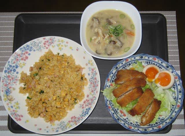 夕食:自作炒飯、粕汁、ファミチキ、煮卵