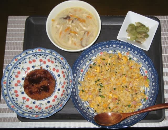 夕食:卵炒飯(改)、ハムカツ、粕汁、搾菜