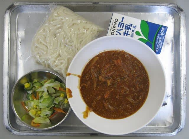 昼食:ミートソース麺、フレンチサラダ