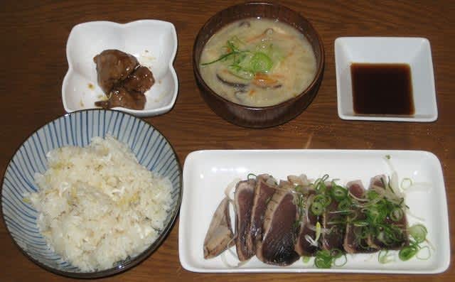 夕食:鯛飯、鰹のたたき、粕汁、肝の甘露煮