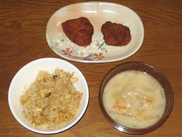 朝食:KFCの炊き込みご飯、粕汁、ヒレカツ