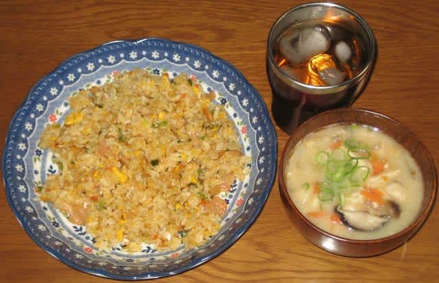 炒飯はシャウエッセンとミックスベジタブル、ハウスの炒飯の素で作った。後はその辺のもので終わり。味噌汁だけは食事の前に自作した。