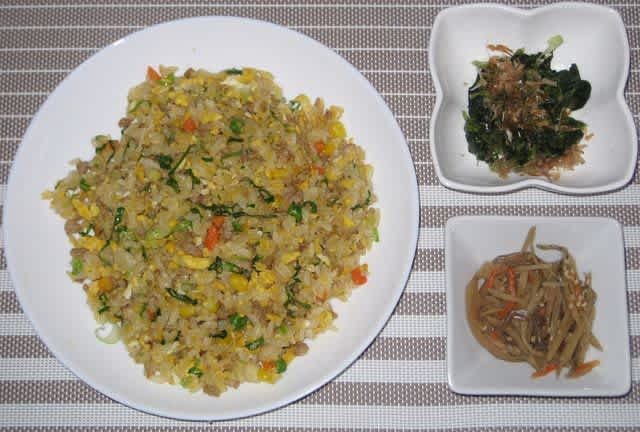 朝食:自作炒飯、ほうれん草のおひたし、蓮根のきんぴら