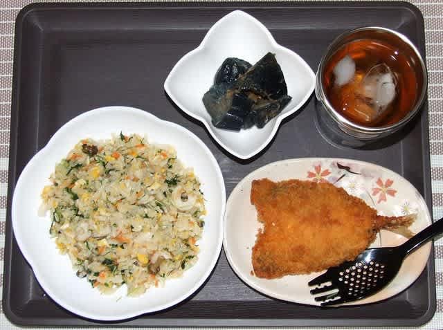夕食:菜飯、アジフライ、茄子の煮浸し