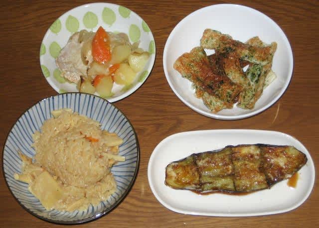 昼食:筍ご飯、(新)鶏肉の麹焼き、(自作)竹輪磯辺+茄子の蒲焼き風